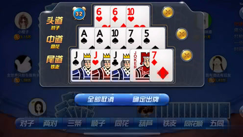 先比牌型,前面、中間和後面的牌進行比較大小,最大的就是贏