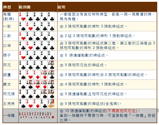 百變13張:同樣是52張牌,每個玩家都是13張牌,只是他們的牌型大小不同,具體如下: