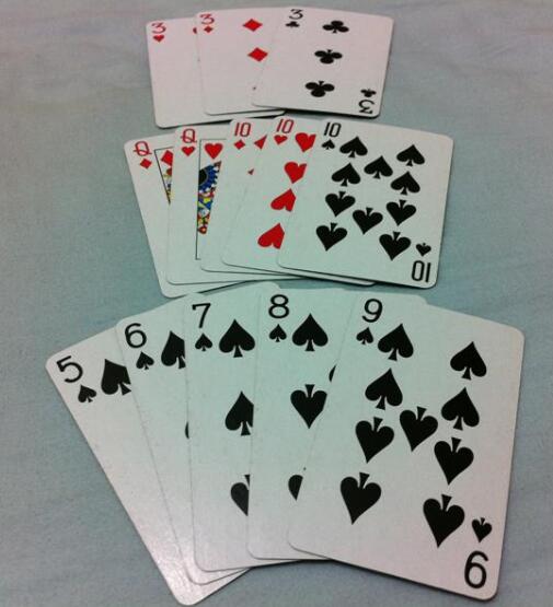 葫蘆: 五張中有三張相同數字的牌及另外兩張相同數字的牌
